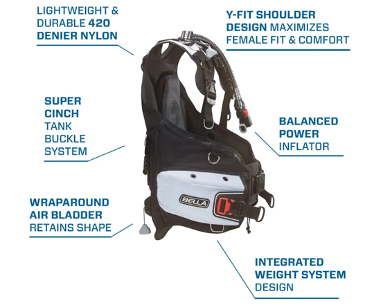 Loaded with convenience and performance features, the Bella’s exclusive wraparound bladder retains its cradle-like shape even when fully inflated, providing a comfortable fit and stable position both at depth and on the surface. It also sports a Y-Fit shoulder design that fits the female body better, allowing for excellent control and increased range of motion for the arms. A stainless steel triangular ring manages the forces in the Y’s center, balancing pressure over the body and keeping the harness under control, regardless of your position in the water. This makes for a comfortable and secure ride while cruising the depths.