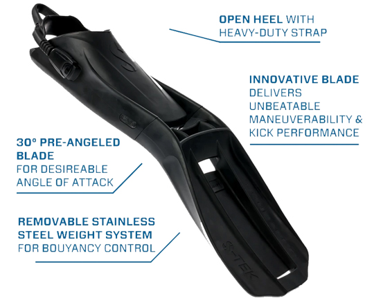 Constructed of durable Monprene® for maximum durability and designed with an ultra-streamlined profile, the S-Tek Fin’s 30º pre-angled blade requires less deflection to achieve the desired angle of attack for an efficient kick. This allows for a stiffer blade without increasing drag, thereby reducing leg cramps and ankle strain while delivering unbeatable maneuverability and alternate kick performance.